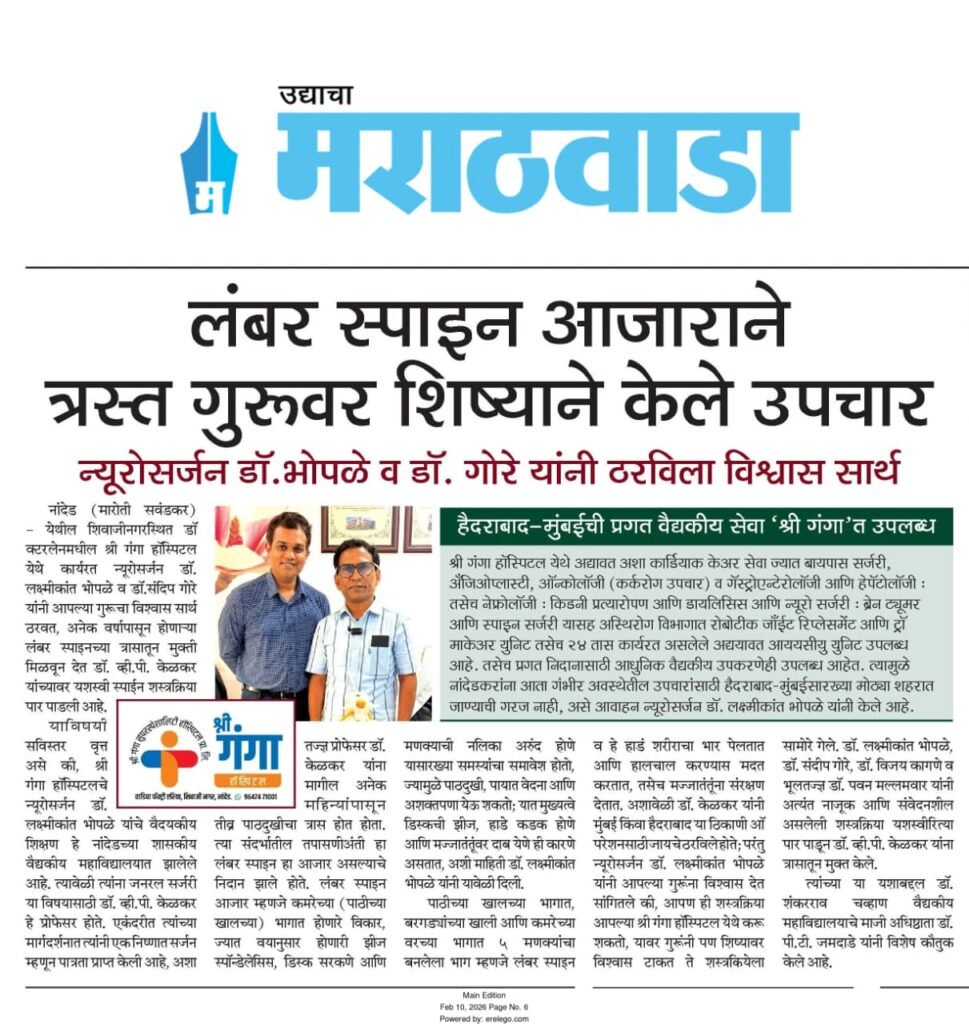 श्री गंगा हॉस्पिटलमध्ये न्यूरोसर्जरी, ऑर्थोपेडिक्स आणि स्पाइन उपचारांसाठी अत्याधुनिक सुविधा उपलब्ध असून अनुभवी डॉक्टरांची टीम २४ तास सेवा देत आहे. त्यामुळे नांदेडसह संपूर्ण मराठवाड्यातील रुग्णांना आता मोठ्या शहरांकडे जाण्याची गरज उरलेली नाही.